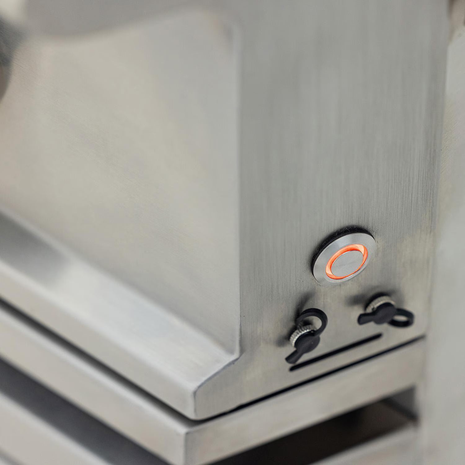 - Non-slip, knurled control knobs feature LED lights with temperature indicators for safety
