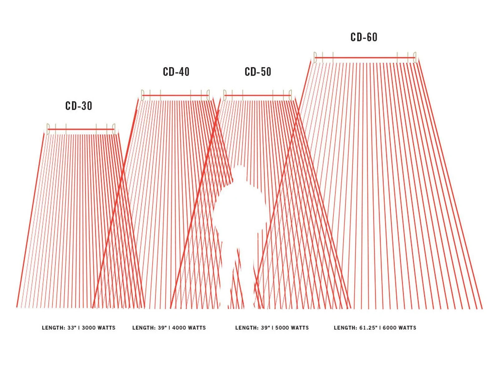 The Infratech CD-Series 39" 5000W single-element heater is ideal for mounting locations between eight and twelve feet. Dual elements are suitable for locations that require more high-impact-focused heating. This wide infrared patio heater is rated for indoor and outdoor use and allows multiple mounting options, such as recessed installations and inset mounting brackets. Full 304-grade stainless steel ensures that this outdoor heater withstands the impact of exposure to outdoor elements for years of day-to-day use.